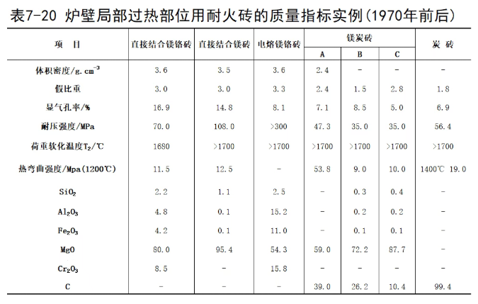 對于局部過熱用的耐火材料,如當時期待的“起到煉鋼用耐火材料的試驗廠的作用”那樣,使用了最高性能的耐火材料,試用了磷酸鹽結(jié)合氧化鎂質(zhì),電解鉻鎂質(zhì)等當時最高級的耐火磚,緊接著研制1種優(yōu)質(zhì)耐火材料為鎂炭磚,此時為1970年。表7-20所示為當時局部過熱部位用耐火磚的質(zhì)量指標。